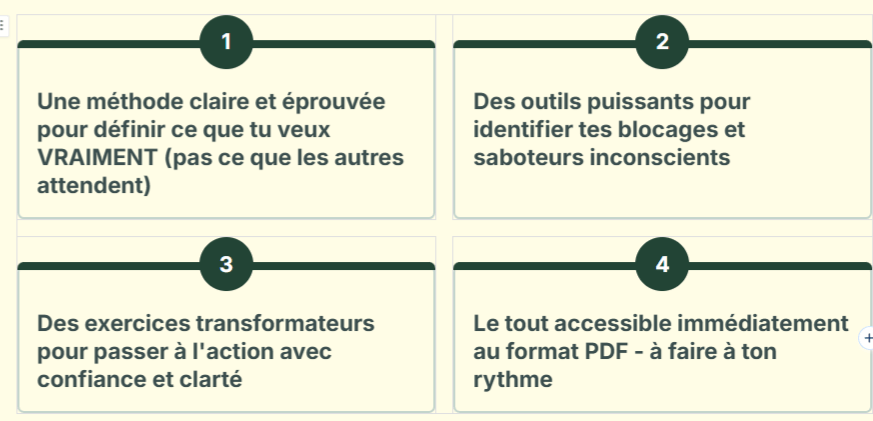 « Les exercices m'ont permis de clarifier ma vision. Je me sens enfin alignée. » – Nathalie, 45 ans